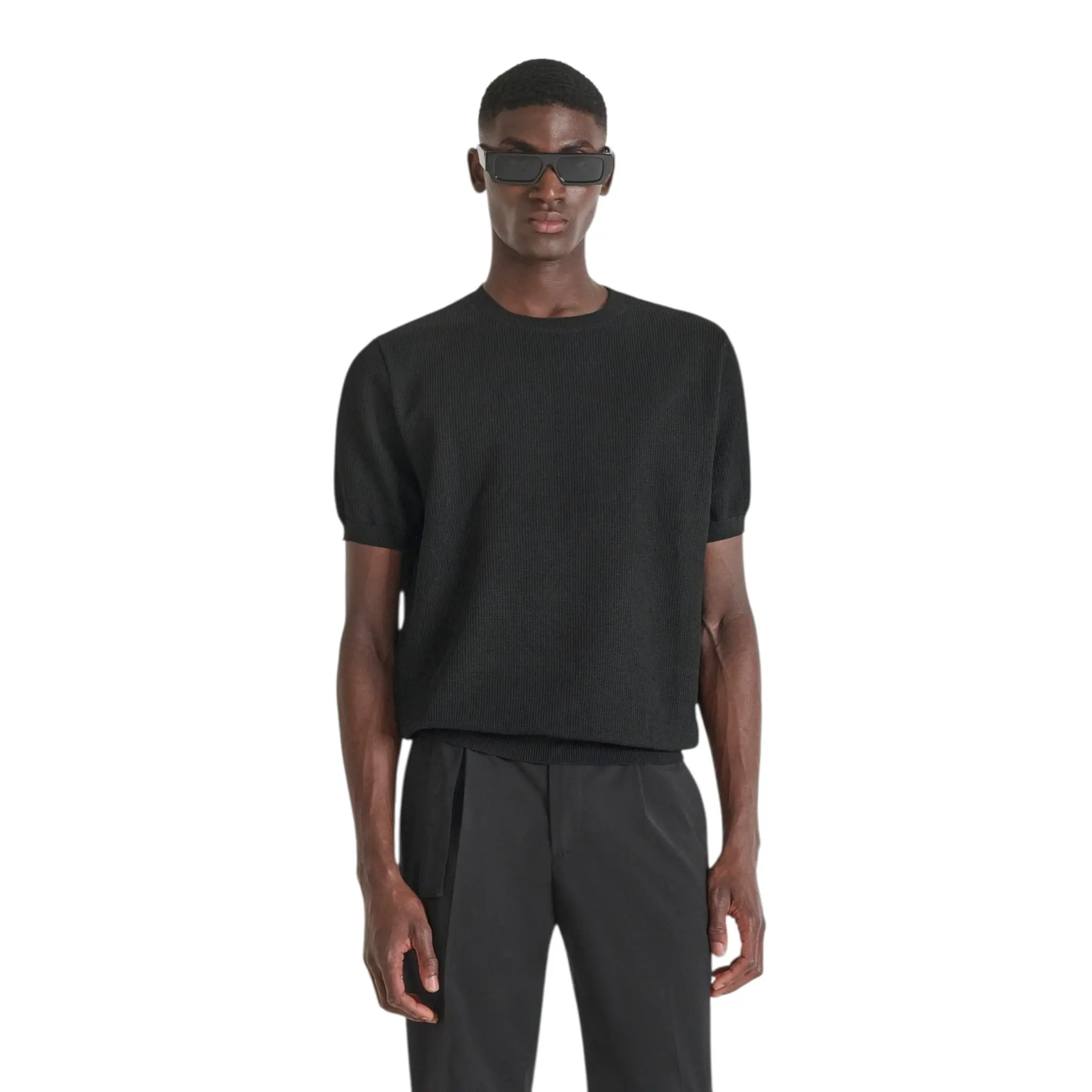 A short-sleeved crew-neck sweater with a regular fit, made of comfortable viscose-blend jersey yarn. Knitted armholes, bottom and collar. Small metal logo tag sewn on the back. A perfect garment for those looking for an elegant and modern look, this sweater goes perfectly with any look and can be worn on its own as an alternative to the classic T-shirt or as a base layer.