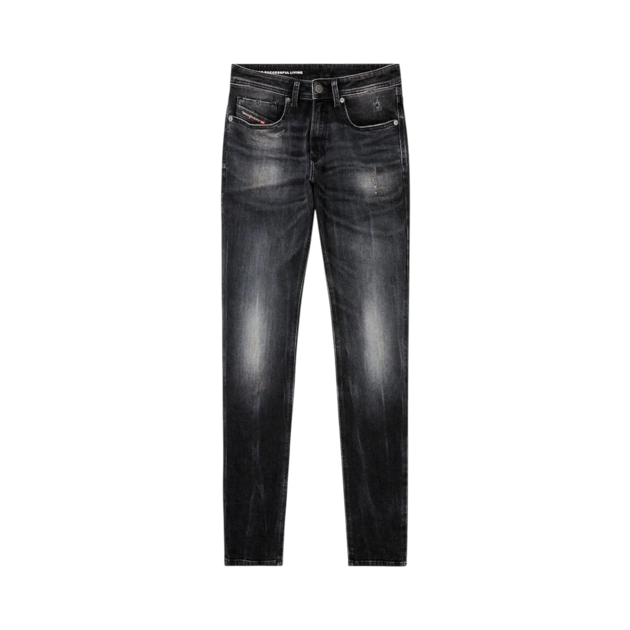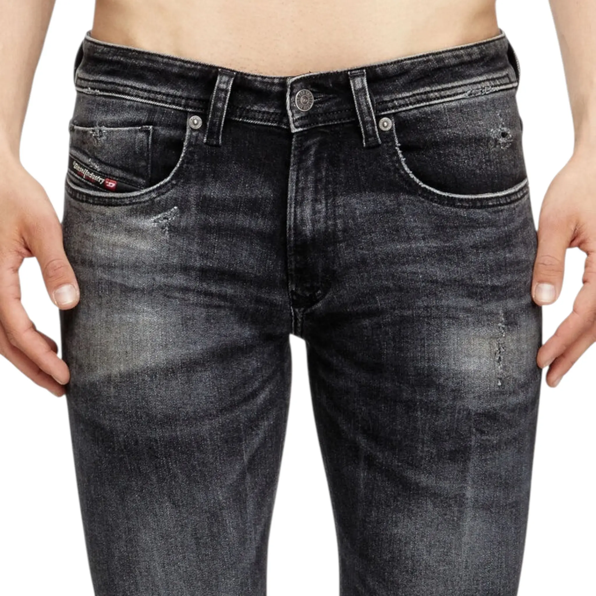 Confeccionado en denim elástico en un lavado negro, detallado con bigotes, efectos usados y abrasiones. Icónico y distintivo, forma parte de los lavados de ADN de Diesel.