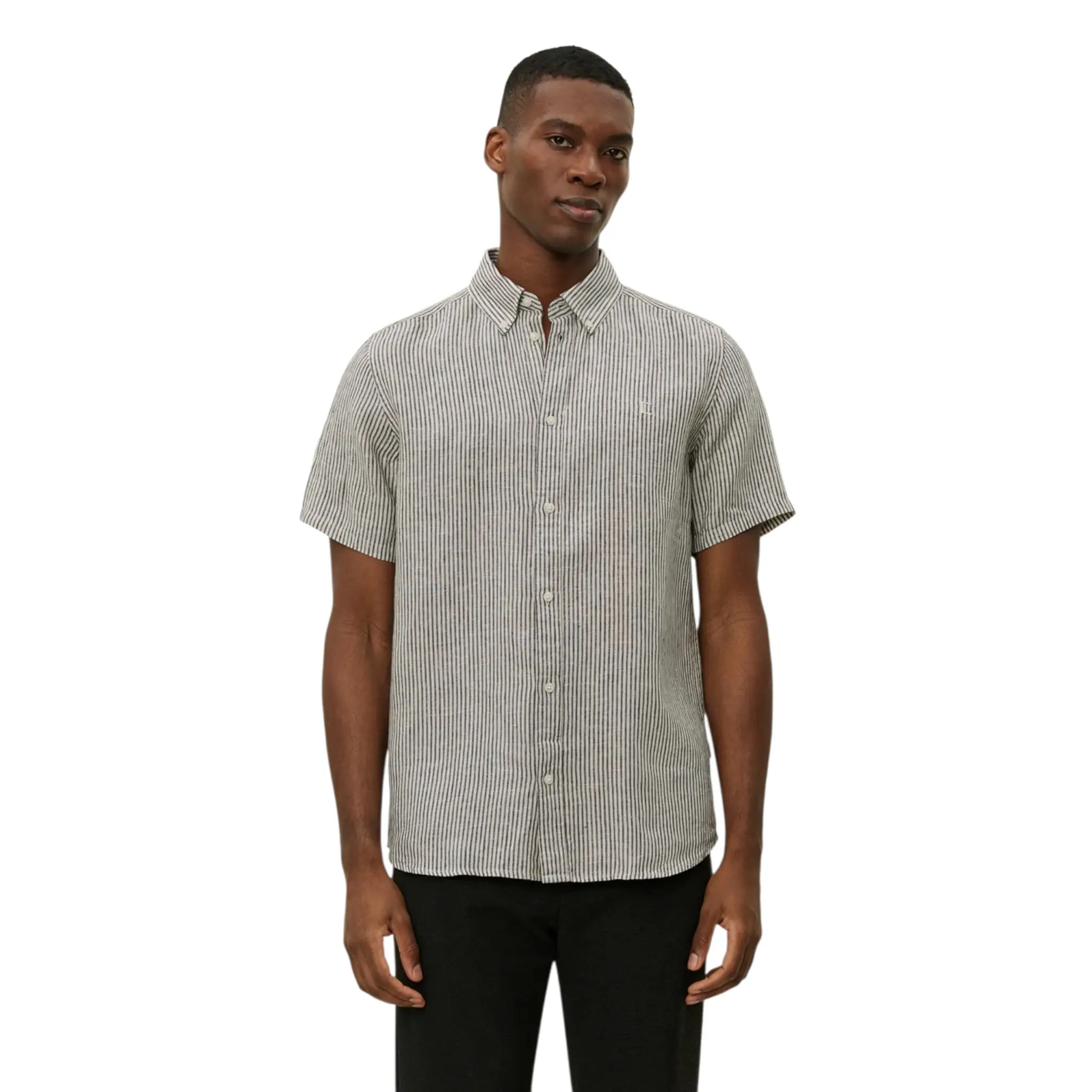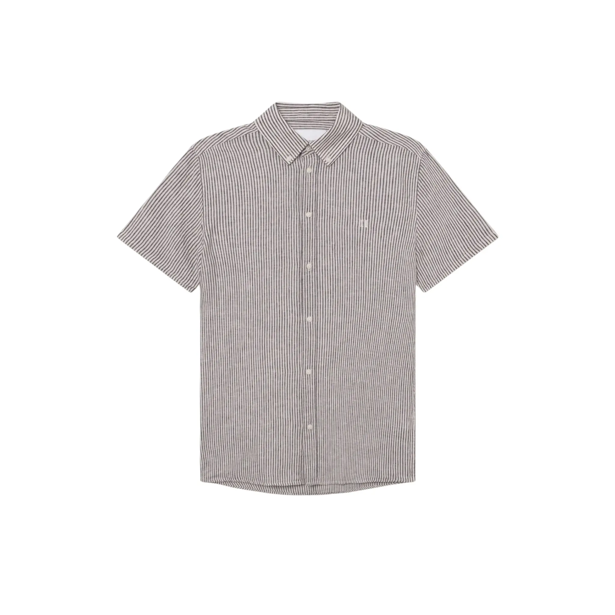 One of our hero pieces, the Konrad Shirt, remade in linen with a classic stripe pattern and short sleeves. It comes with a curved back hem, button-down collar, and embroidered Encore on the chest. A wardrobe workhorse for warmer months.