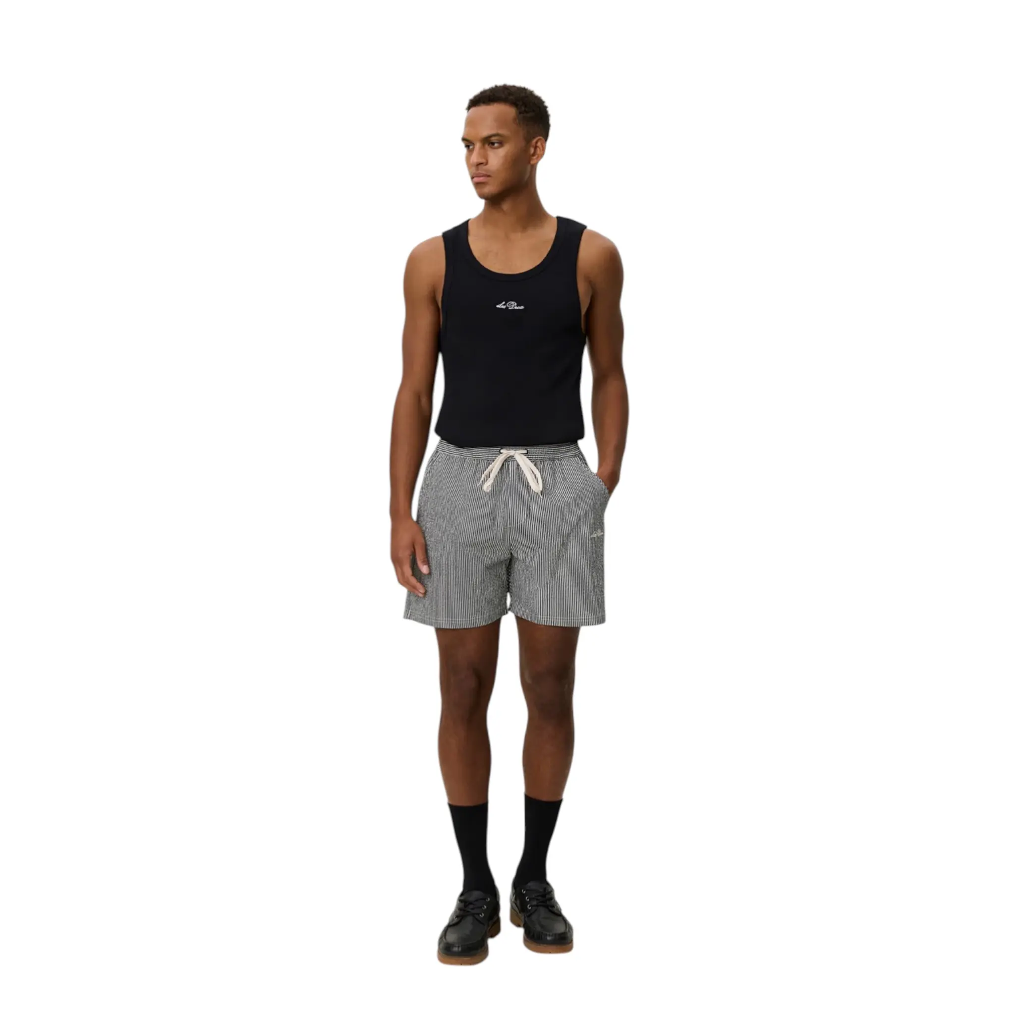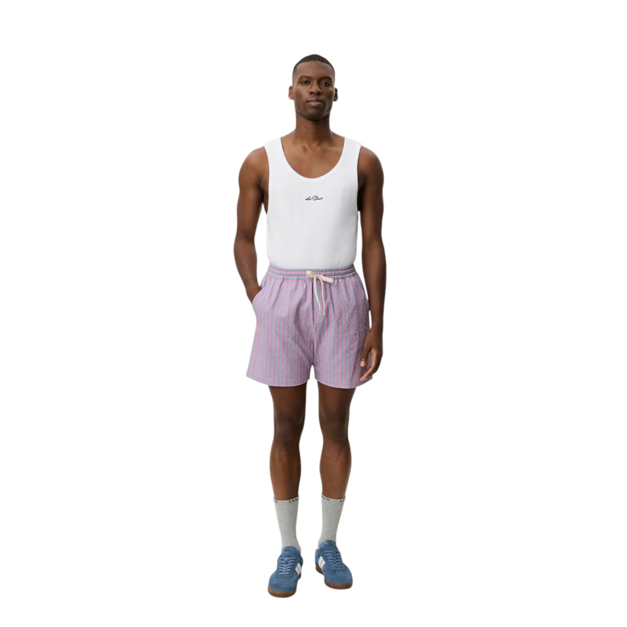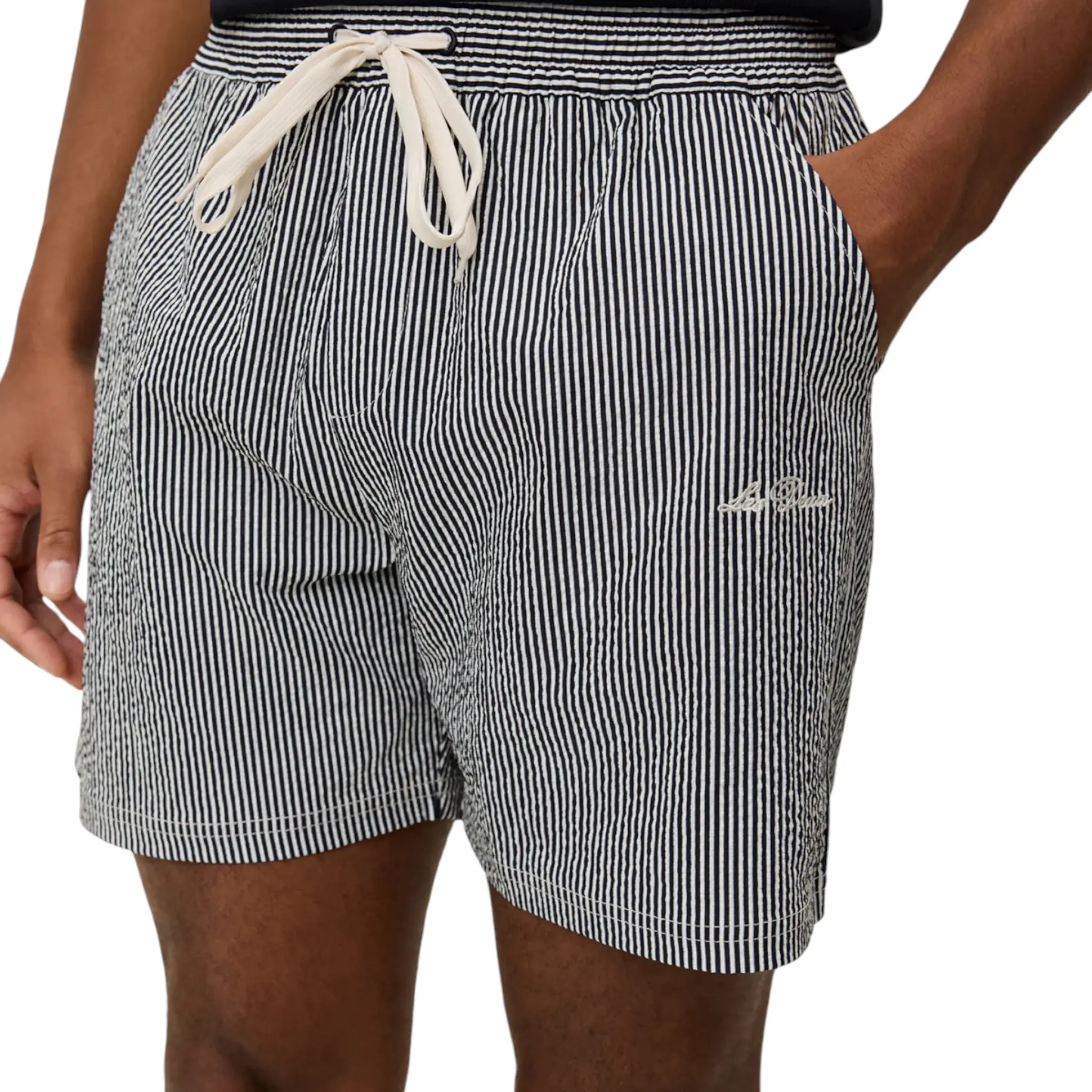 Striped seersucker swim shorts with a textured surface and a relaxed cut. Designed with an elasticated waist and subtle front embroidery.