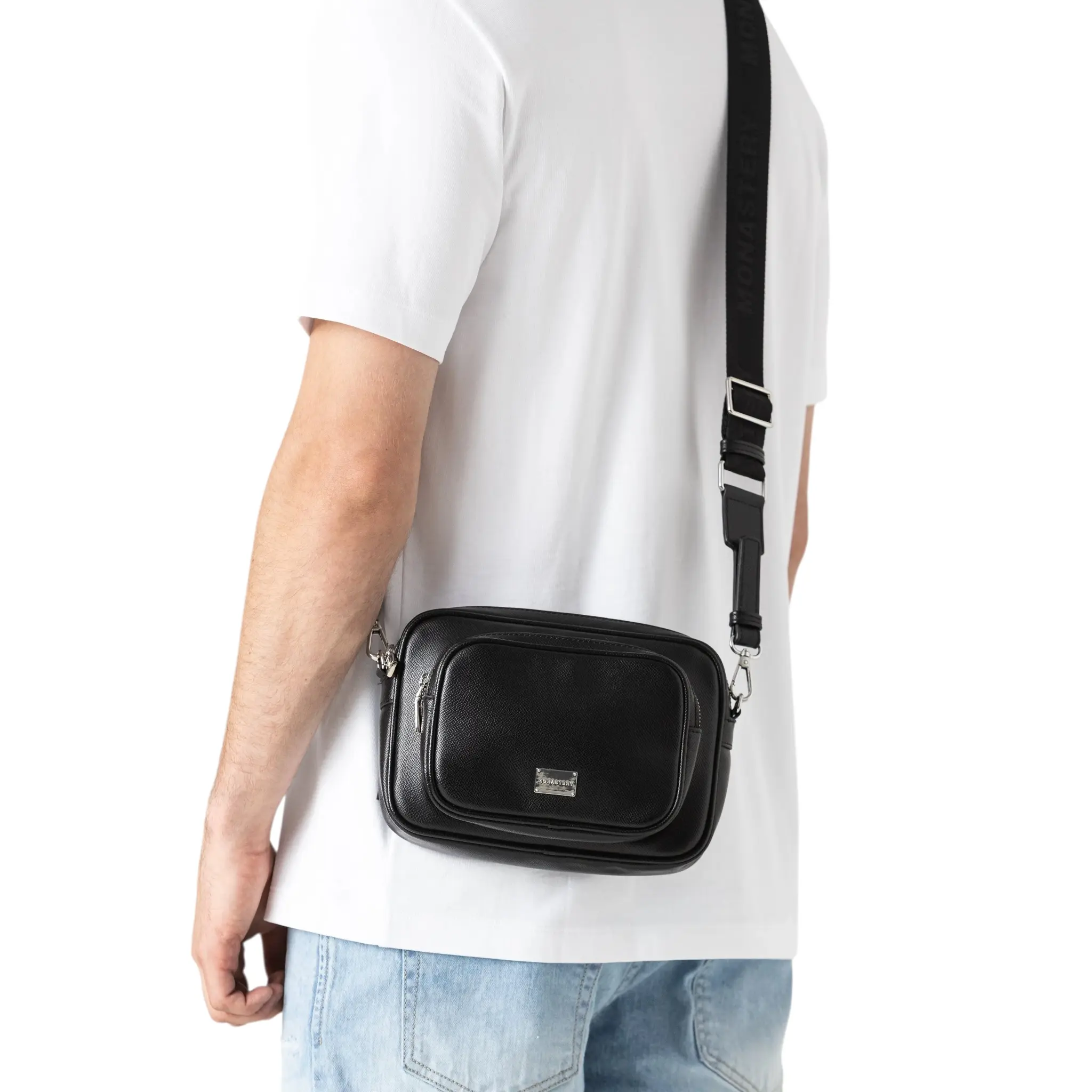 El FannyPack Shum ofrece un amplio compartimento principal con doble slider, facilitando su apertura y comodidad. En su cara exterior, presenta el logo Monastery estampado en letras plata brillante, armonizando con sus herrajes y cierres.