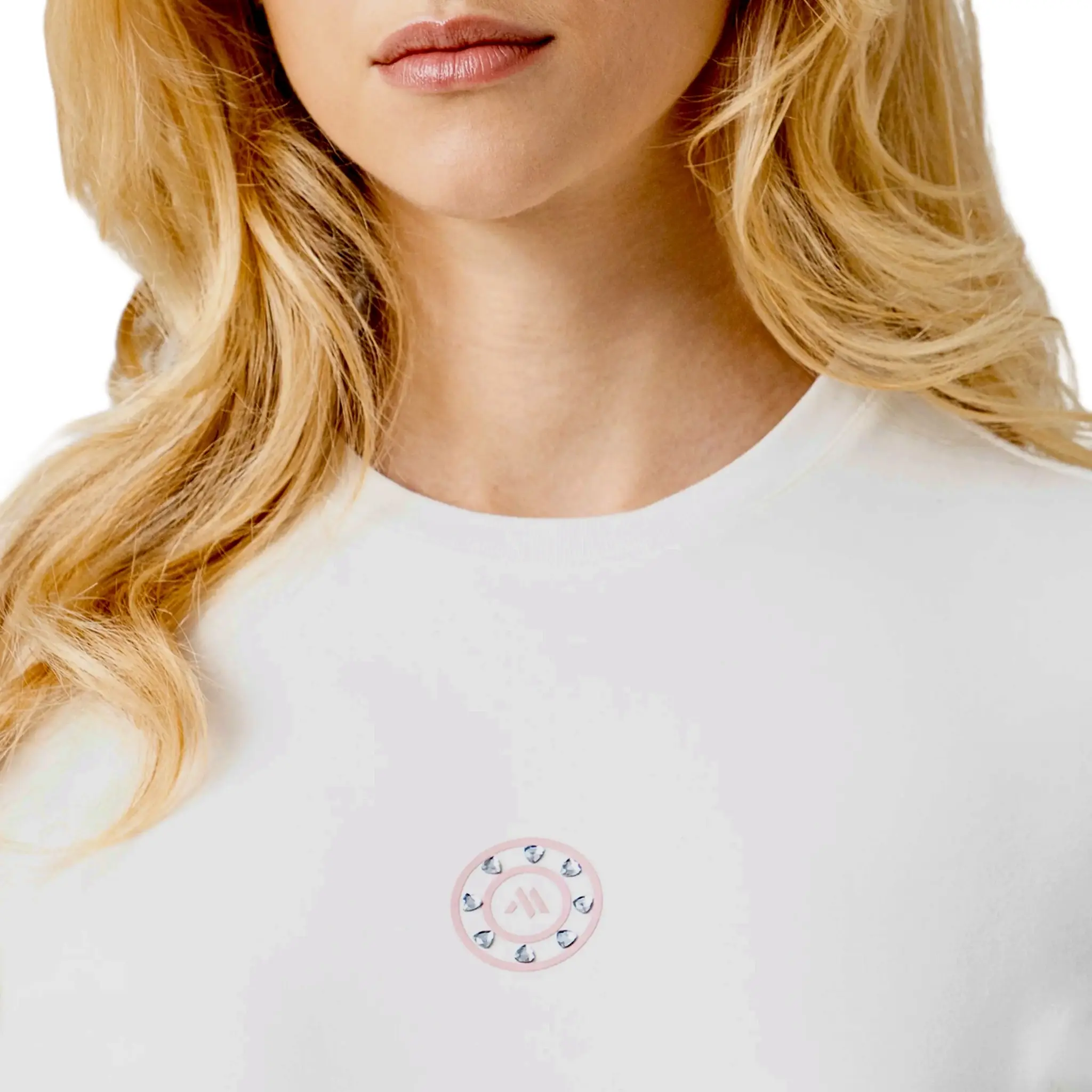 Camiseta para mujer elaborada con una silueta pequeña pensado para resaltar la figura femenina, es elaborada en tela napoleon. Ruby es una prenda diseñada con un estilo elegante que resalta por su sobriedad y sus detalles, contiene en la parte frontal un detalle decorativo compuesto por finos cristales Swarosky, dispuestos en forma circular, añadiendo un toque de lujo y sofisticación al diseño, resaltando de manera significativa nuestro logo insignia Monastery.