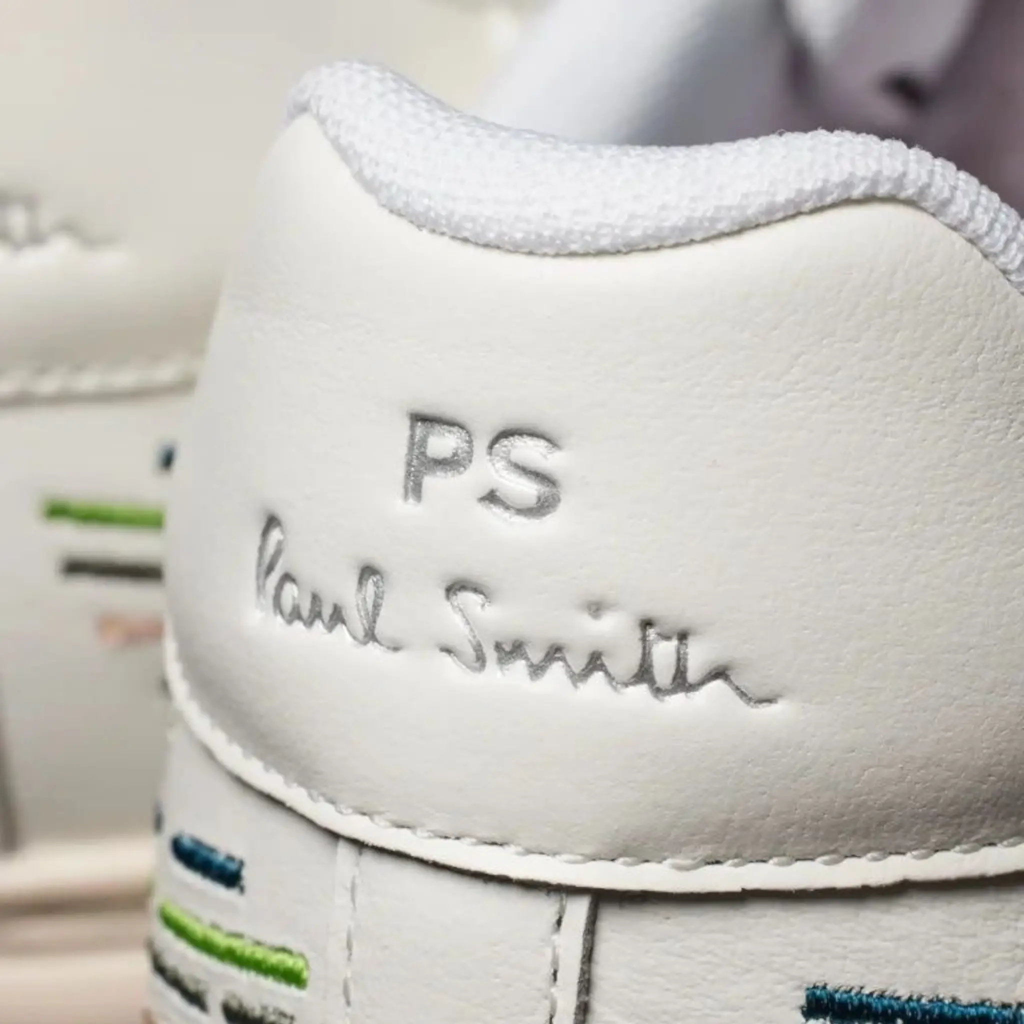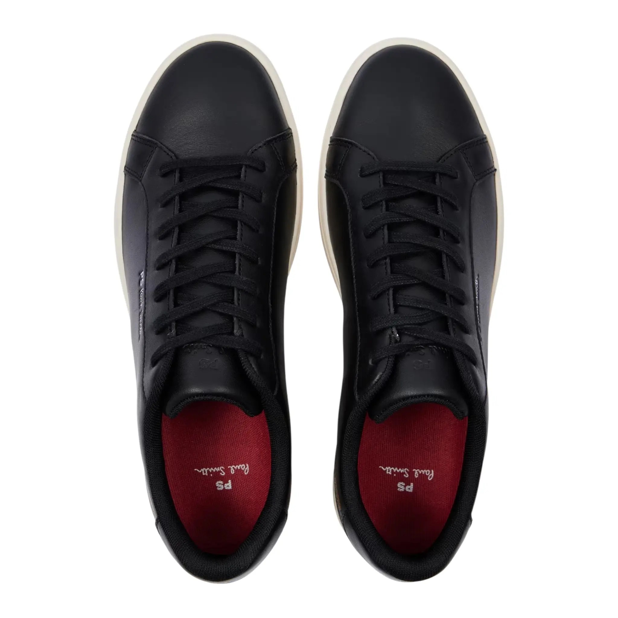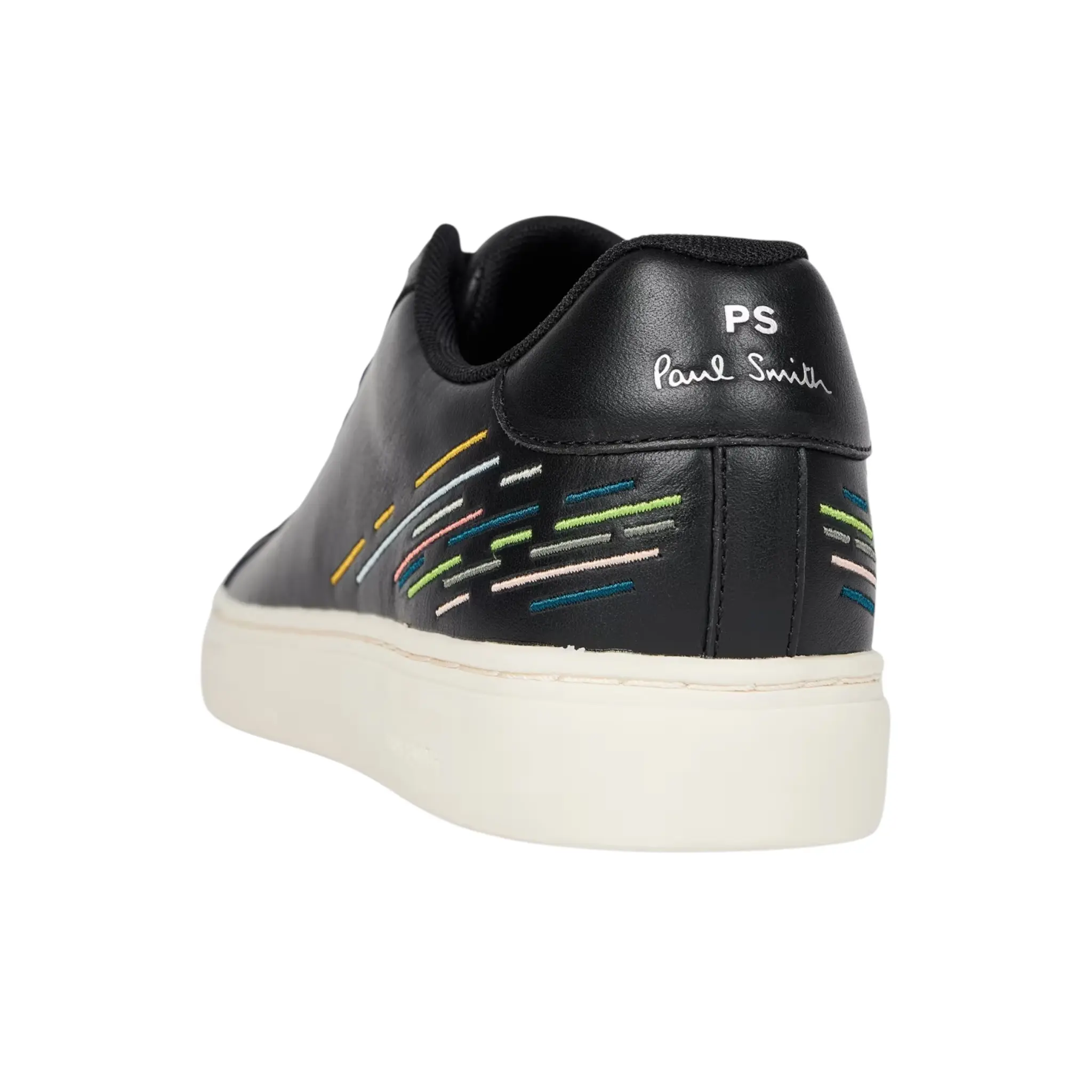 These black ‘Rex’ trainers are made from premium leather uppers and feature an abstract embroidery motif in our ‘Sports Stripe’ colours. Complete with white rubber cupsoles with side-wall stitching, these trainers are finished with an embossed PS logo on the side.